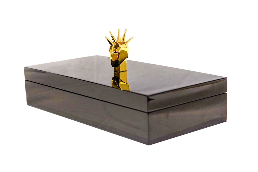 Caja decorativa de MDF color negro con incrustación de aleación de zinc . Dimensiones 36x18x16.5cm.