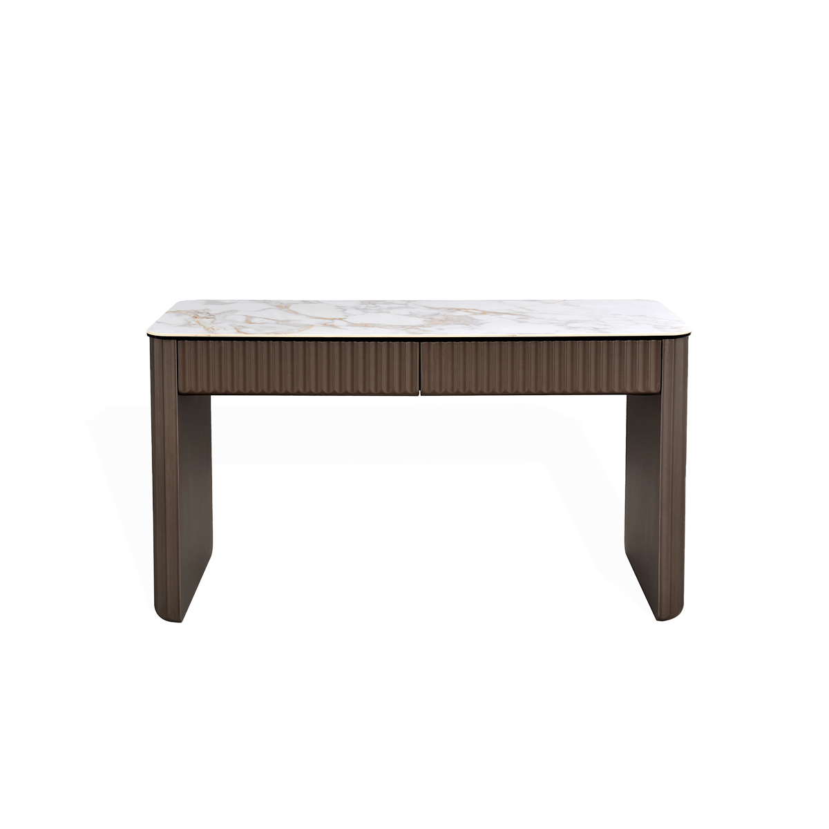 Consola Fabricada en Top de Cerámica con detalles Gold, Cuerpo de MDF con superficie ondulada, Metal color Brown, cuenta con 2 Cajones.Dimensiones: 1.40×0.50×0.765mts