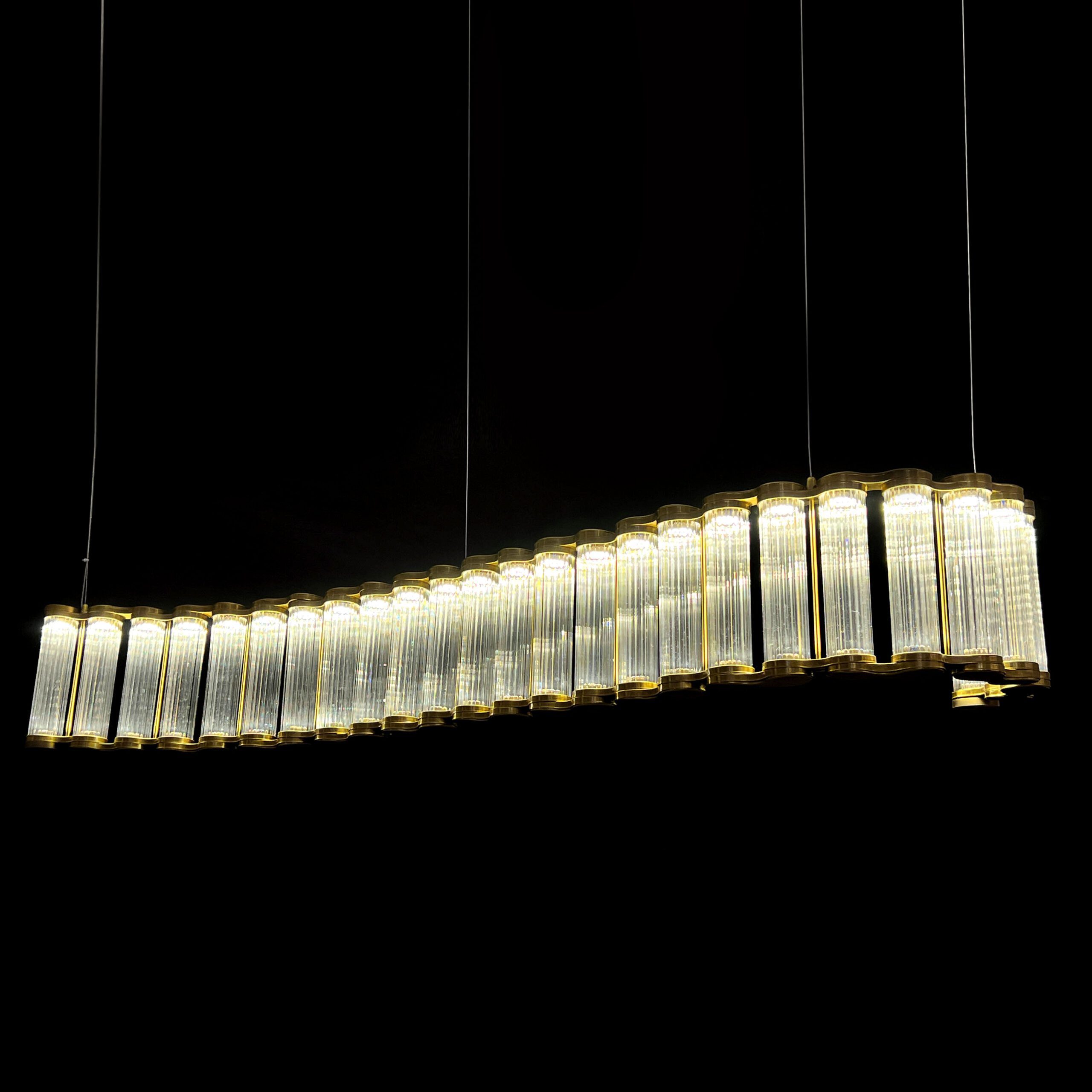Lámpara colgante diseño ondulado con luz Led de 264W y temperatura de 3000k . Elaborada en hierro y vidrio. Dimensiones: Largo de 1.50m Abito / Color: Dorado