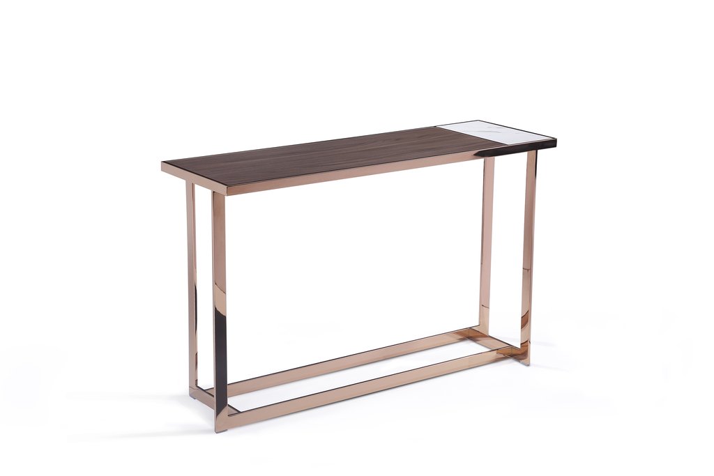 Consola Fabricada con Top de Cerámica Italiana y Chapa de Madera Walnut, Base y Marco de Acero Inoxidable Color Shiny Rose Gold.Dimensiones: 1.20×0.39×0.75mts Abito / Color: WALNUT-ROSE GOLD